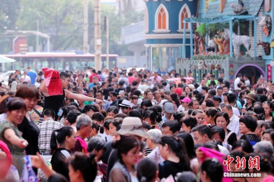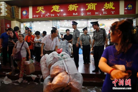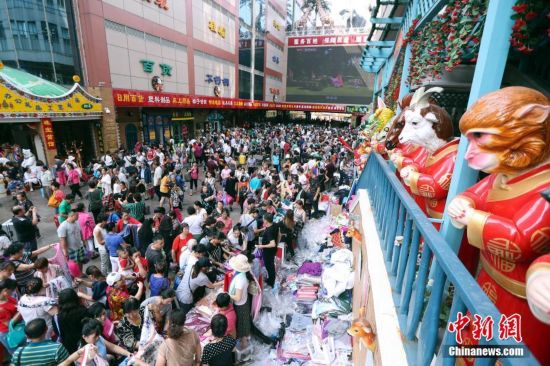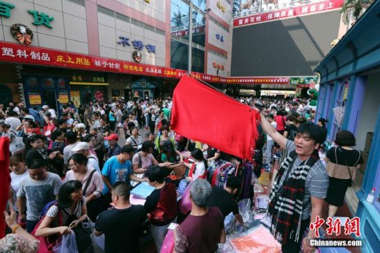 9月15日,商戶聚集在北京天意商城門口甩賣商品,吸引大批顧客搶購(gòu)。天意商城是北京規(guī)模最大的小商品批發(fā)兼零售市場(chǎng),為疏解北京非首都功能,天意商城將于9月16日關(guān)門停業(yè)。中新社記者 盛佳鵬 攝