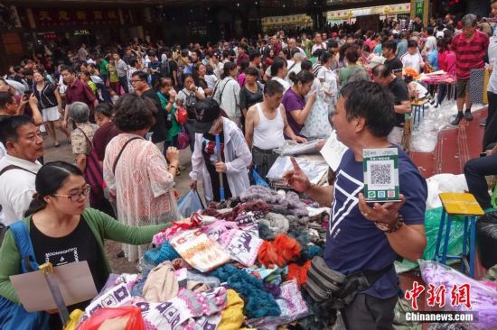 9月15日,天意商戶舉起二維碼方便顧客掃碼支付,以新式支付方式助力傳統(tǒng)零售。當(dāng)日,自1992年開業(yè)至今的北京天意市場(chǎng)迎來其在北京西城阜外大街營(yíng)業(yè)的最后一日,商家趁機(jī)“瘋狂甩貨”,大批北京民眾也紛至沓來。這里曾是北京著名的小商品商城,聚集了數(shù)千家商戶。為疏解北京非首都功能,天意商城將于本月16日關(guān)門停業(yè)。中新社記者 崔楠 攝