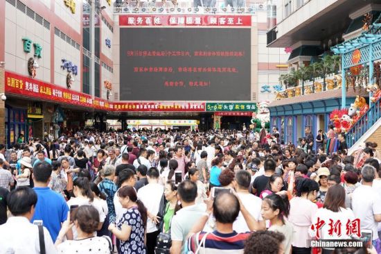 9月15日,市民齊聚天意批發(fā)市場(chǎng)中購(gòu)物。天意商城是北京規(guī)模最大的小商品批發(fā)兼零售市場(chǎng),為疏解北京非首都功能,天意商城將于本月16日關(guān)門停業(yè)。中新社記者 韓海丹 攝