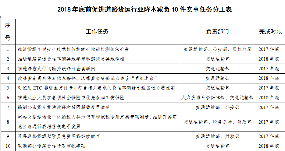 2018年底前,完成降本減負(fù)10件實事(見附件),推動政策落地并取得實質(zhì)性進展。制度性交易成本大幅降低,貨車司機生產(chǎn)生活條件顯著改善,貨運業(yè)戶的獲得感和貨車司機的歸屬感持續(xù)增強,行業(yè)平穩(wěn)發(fā)展的基礎(chǔ)更加牢固。