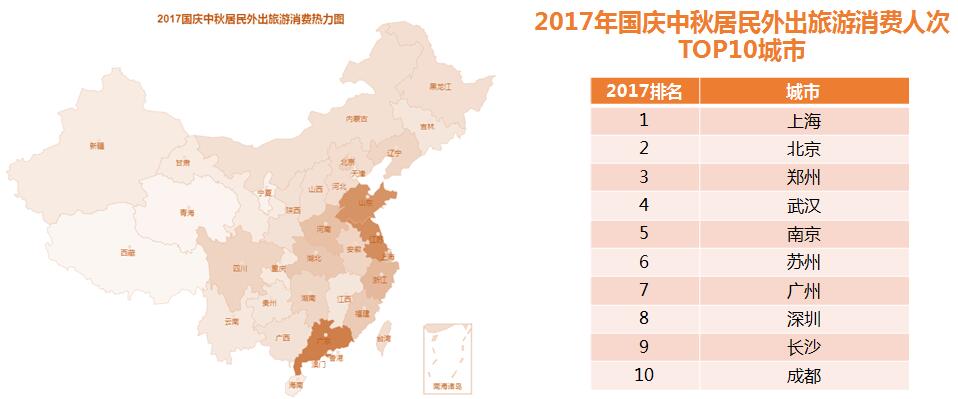 2017年國(guó)慶中秋居民外出旅游消費(fèi)人次TOP10城市:上海、北京、鄭州、武漢、南京、蘇州、廣州、深圳、長(zhǎng)沙、成都。