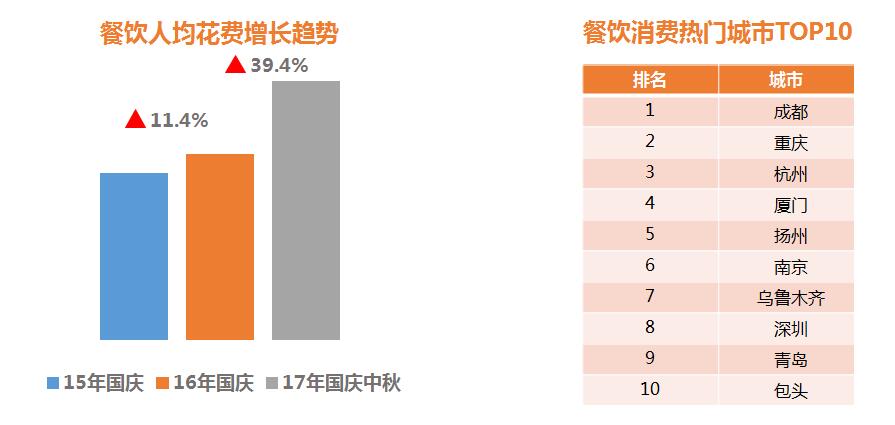 餐飲消費(fèi)熱門(mén)城市TOP10:成都、重慶、杭州、廈門(mén)、揚(yáng)州、南京、烏魯木齊、深圳、青島、包頭。