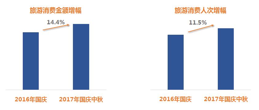 2017年國(guó)慶、中秋佳節(jié)雙節(jié)喜相逢,假期疊加形成8天“超級(jí)黃金周”,居民出游意愿較高,旅游需求旺盛,旅游消費(fèi)金額及人次同比增幅均在10%以上。