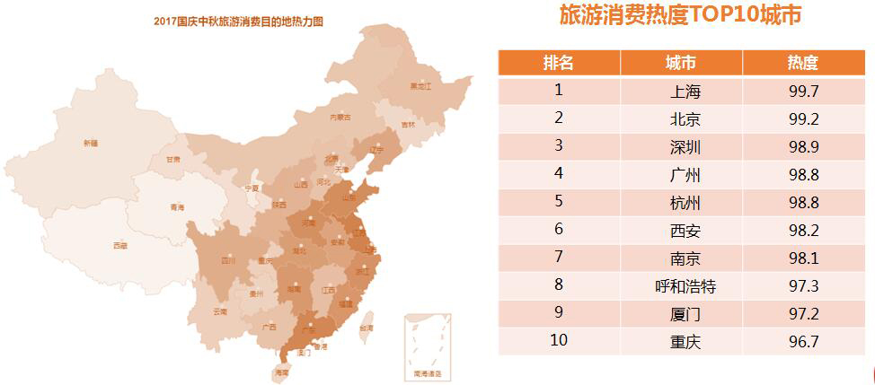 2017年國(guó)慶中秋假日旅游消費(fèi)熱門(mén)目的地輻射范圍較廣,華東、華中、華南、東北地區(qū)旅游消費(fèi)熱度均較高,其中熱度TOP10城市均為知名旅游城市。
