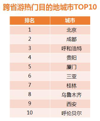 跨省游熱門(mén)目的地城市TOP10:北京、成都、呼和浩特、貴陽(yáng)、廈門(mén)、三亞、桂林、烏魯木齊、西安、呼倫貝爾。
