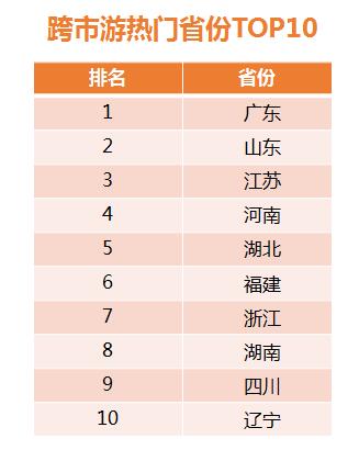 跨市游熱門(mén)省份TOP10:廣東、山東、江蘇、河南、湖北、福建、浙江、湖南、四川、遼寧。