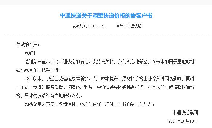 而中通快遞于10月10日也公布漲價訊息,官網(wǎng)刊文稱,中通快遞集團經(jīng)綜合考慮,決定從即日起調(diào)整快遞價格,具體情況請咨詢當(dāng)?shù)胤⻊?wù)網(wǎng)點。