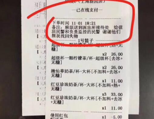 民警四處詢問了下,沒人下過單,快遞小哥連忙遞上手中的外賣單,上面寫著:麻煩送到派出所接待處,給值班民警和負責(zé)監(jiān)控的民警,謝謝他們幫我找回失物。