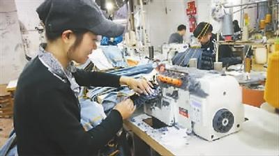 將白色寬邊松緊帶折進(jìn)布條,疊好后放到褲腰位置,在五線鎖邊機(jī)下轉(zhuǎn)一圈,15秒不到,一個(gè)褲腰上好。不一會(huì)兒,謝藍(lán)珍就將手邊的20條童褲整理好,拿到拉腰機(jī)前鎖邊、壓線。她告訴記者,再壓下褲腳,今天的生產(chǎn)任務(wù)就算完成了。另一套機(jī)器旁,她的丈夫余效柱正在做最后的褲腳活兒!白鲆徽容^好,不膩。在流水線上只做一個(gè)環(huán)節(jié)太單調(diào)了!敝x藍(lán)珍說(shuō)。