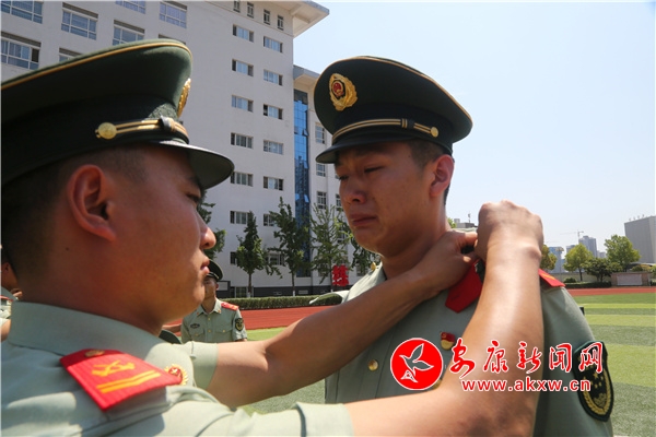 “我是中國(guó)人民武裝警察部隊(duì)軍人,我宣誓……”離隊(duì)前,武警安康支隊(duì)組織滿服役期士兵開展退役儀式。滿服役期老兵身披綬帶、胸戴紅花,最后一次站在軍旗前以軍人的身份,重溫誓詞、向軍旗敬禮。期間,留隊(duì)?wèi)?zhàn)友為滿服役期士兵卸下警銜、領(lǐng)花、帽徽和胸標(biāo),為他們戴上“光榮花”。“8年了 ,突然要離開,還真有點(diǎn)舍不得。”卸下肩章的那一刻,下士趙毅璞眼中泛起的淚花忍了又忍,終究還是沒能忍住。