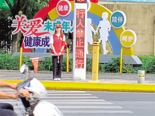 大學(xué)生志愿者劉沁怡在交通路口開展“文明交通”志愿服務(wù)。