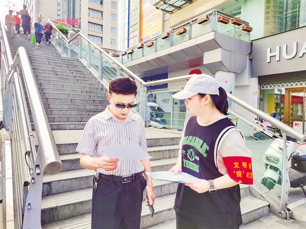 大學(xué)生志愿者張玉淑雅向過往路人宣傳文明行為規(guī)范。