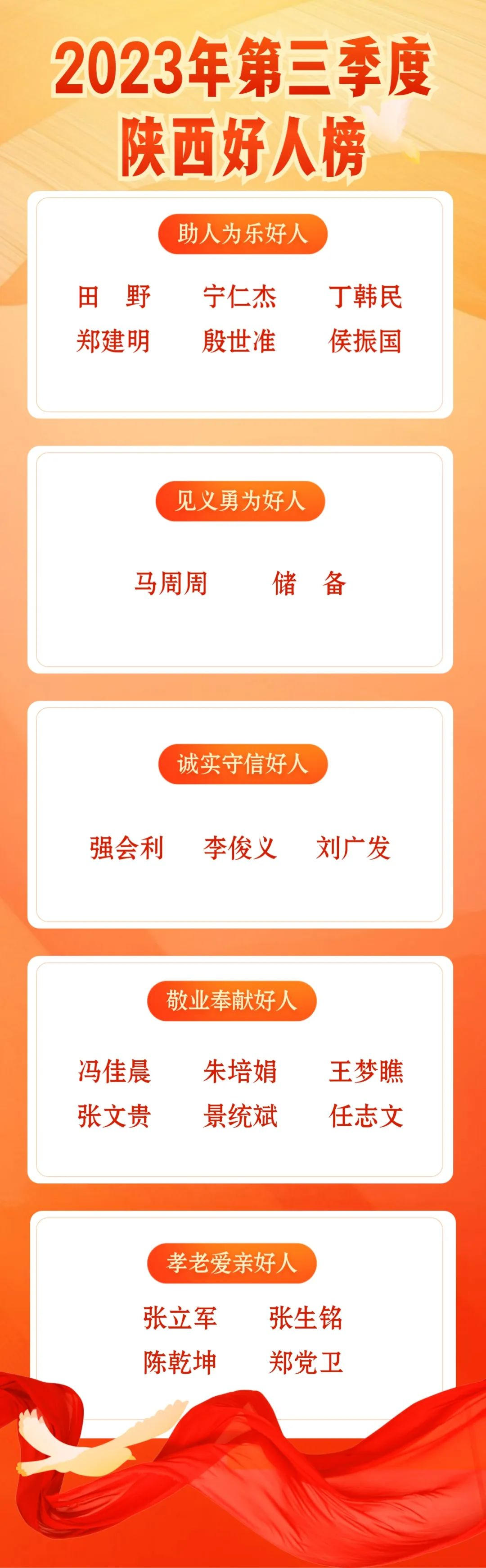 10月13日,2023年第三季度陜西好人榜發(fā)布儀式暨“奮進(jìn)新時(shí)代 聚力譜新篇”新時(shí)代文明實(shí)踐展演活動(dòng)在榆林陽光廣場(chǎng)舉行。此次共有田野、強(qiáng)會(huì)利、馮佳晨等21名身邊好人登上第三季度“陜西好人榜”。其中,我市儲(chǔ)備、陳乾坤2人分別入選2023年第三季度“陜西好人榜”名單見義勇為好人、孝老愛親好人。