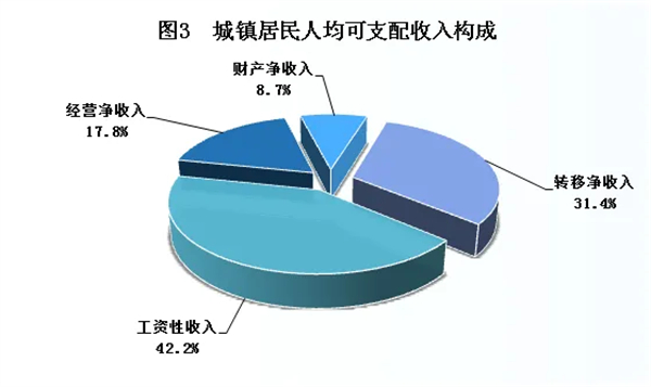 全市城鎮(zhèn)居民人均可支配收入33639元,比上年增加1663元,增長5.2%。其中,工資性收入14181元,增長5.0%,占可支配收入的比重為42.2%;經(jīng)營凈收入5995元,增長4.7%,占比17.8%;財產(chǎn)凈收入2910元,增長5.8%,占比8.7%;轉(zhuǎn)移凈收入10553元,增長5.6%,占比31.4%。
