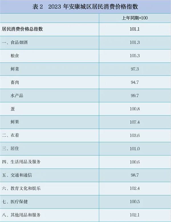 2023年,安康城區(qū)居民消費價格比上年上漲1.1%。