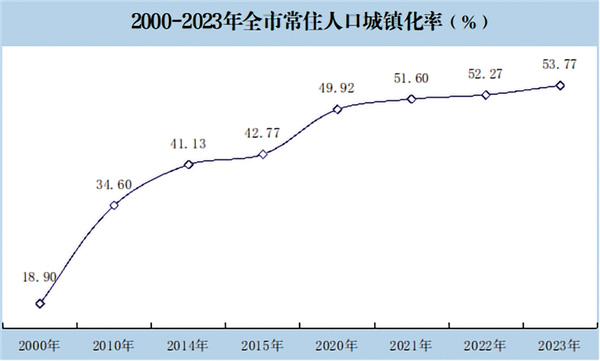 城鎮(zhèn)化步伐明顯加快。1949年,安康總?cè)丝?46.75萬人,其中農(nóng)業(yè)人口占89.4%,屬于典型傳統(tǒng)的農(nóng)村社會,交通不便,人員相對封閉不流動。改革開放后,市場經(jīng)濟(jì)體制逐步建立,特別是2000年撤地設(shè)市,對安康具有劃時代和里程碑的意義。2021年旬陽撤縣設(shè)市,成為陜南首個縣級市,標(biāo)志著全市城鎮(zhèn)化步伐邁向更高水平。全市抓住東部勞動密集型產(chǎn)業(yè)向中西部轉(zhuǎn)移的機(jī)遇,依托易地搬遷集中安置點(diǎn),大力興辦新社區(qū)工廠,把農(nóng)民變?yōu)榫用,大力開展新環(huán)境、新服務(wù)、新產(chǎn)業(yè)、新民風(fēng)、新生活“五新”社區(qū)創(chuàng)建工作,完善配套設(shè)施,健全服務(wù)體系,城鎮(zhèn)化建設(shè)步伐顯著加快。2023年,全市戶籍人口300.75萬人,常住人口245.72萬人。常住人口城鎮(zhèn)化率由2000年的18.9%,提高到2023年的53.77%,23年間提高了34.87個百分點(diǎn)。