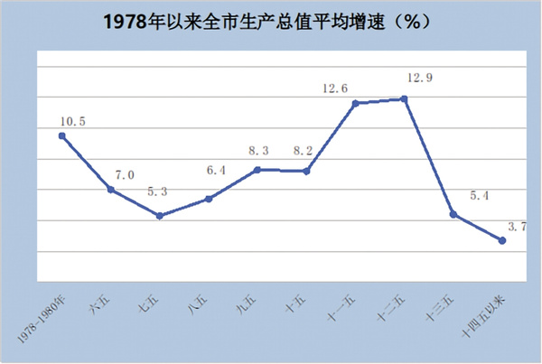 追趕超越步履堅(jiān)實(shí)。從增速看,“六五”到“十五”年均增速為個位數(shù);“十一五”“十二五”時期發(fā)展較快,年均增速兩位數(shù),“十三五”年均增長5.4%,“十四五”前三年平均增長3.7%。從具體年份看,2007—2016年連續(xù)10年保持兩位數(shù)增長,其中2012年增長15.2%。自2009年起,全市GDP增速持續(xù)高于全省平均水平,尤其是2015年躍居全省第一,2015—2019年連續(xù)5年保持全省首位,呈后來居上、追趕超越之勢。2020年受疫情沖擊,增速回落至全省第9位,2023年全市經(jīng)濟(jì)平穩(wěn)恢復(fù),增長1.7%,發(fā)展進(jìn)入新常態(tài)。