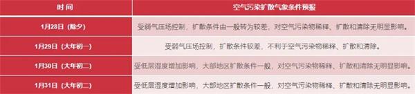1月24日至27日,受雨雪降溫天氣影響,擴(kuò)散條件較好。1月28日至29日,地面氣壓場轉(zhuǎn)弱,擴(kuò)散條件轉(zhuǎn)差,我市大部空氣質(zhì)量以良至輕度污染為主,煙花爆竹集中燃放時(shí)段可能出現(xiàn)短時(shí)重度或以上污染,首要污染物為PM2.5。1月30日至31日,受低層濕度增加影響,擴(kuò)散條件一般。2月1日至4日,受冷空氣清除作用影響,擴(kuò)散條件較好。