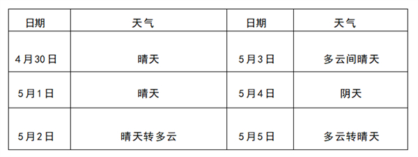 預(yù)計(jì)“五一”期間我市川道地區(qū)最低氣溫13~19℃,最高氣溫32~36℃,高山地區(qū)最低氣溫10~14℃,最高氣溫29~32℃。