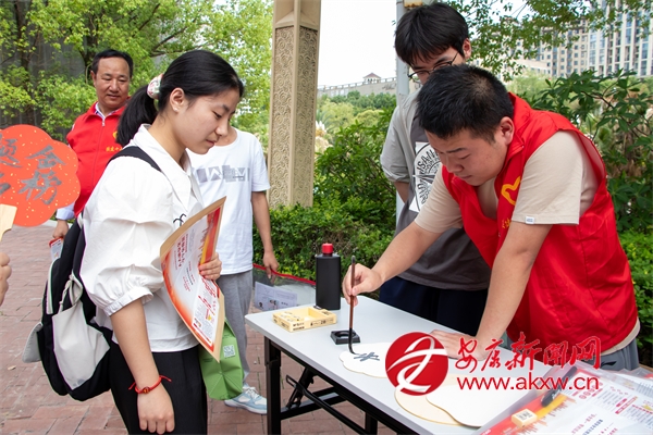 “翰墨飄香,助力高考”書法創(chuàng)作活動中,書法愛好者揮毫書志,將靈動筆墨化作滿滿的祝福,為考生加油鼓勁。