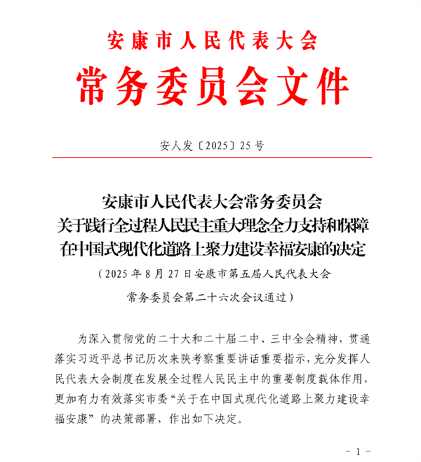 本網(wǎng)訊(通訊員 周清華 張凡)8月27日,安康市五屆人大常委會(huì)第二十六次會(huì)議作出《安康市人民代表大會(huì)常務(wù)委員會(huì)關(guān)于踐行全過(guò)程人民民主重大理念全力支持和保障在中國(guó)式現(xiàn)代化道路上聚力建設(shè)幸福安康的決定》(以下簡(jiǎn)稱《決定》),并自印發(fā)之日起實(shí)施。以地方人大常委會(huì)作出重大事項(xiàng)決定的形式,將黨的主張通過(guò)法定程序轉(zhuǎn)化為全體人民的共同意愿,是安康市人大常委會(huì)強(qiáng)化擔(dān)當(dāng)、依法履職的創(chuàng)新實(shí)踐,是圍繞中心、服務(wù)大局的務(wù)實(shí)舉措,必將為在中國(guó)式現(xiàn)代化道路上聚力建設(shè)幸福安康注入堅(jiān)實(shí)的人大力量。