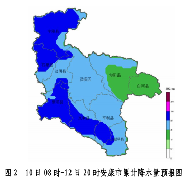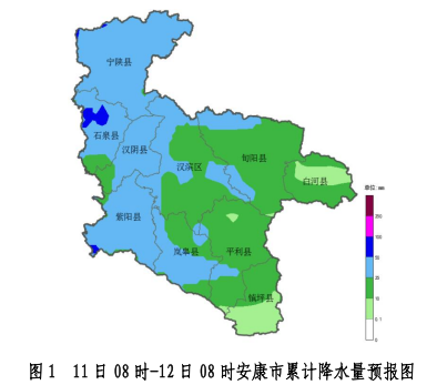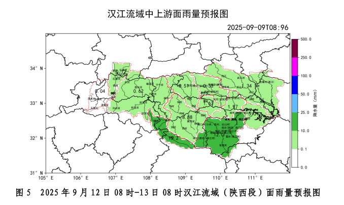 預(yù)計10日08時-11日08時漢江流域(陜西段)大部面雨量0.1~10毫米,玉帶河、酉水河、子午河、任河流域面雨量10-25毫米,褒河流域面雨量25-50毫米(圖3);11日08時-12日08時漢江流域(陜西段)褒河、酉水河、子午河、任河面雨量25~50毫米,其余中小河流流域面雨量10~25毫米(圖4);12日08時-13日08時漢江流域(陜西段)任河、堵河流域面雨量達(dá)10~25毫米,其余中小河流流域面雨量0.1~10毫米(圖5)。