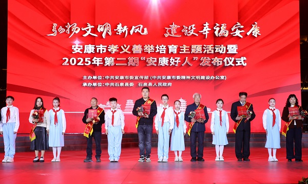 本次活動以“弘揚文明新風 建設幸福安康”為主題,由市委宣傳部主辦、石泉縣委和縣政府承辦,旨在深入學習貫徹黨的二十屆四中全會精神,扎實推進崇德向上幸福安康建設;顒蝇F(xiàn)場,通過播放典型人物短片、現(xiàn)場互動訪談等形式,生動再現(xiàn)了陳登發(fā)、高虎、黃壽琴等好人代表的感人事跡。市級領導及“中國好人”“陜西好人”等先進典型代表為28名新入選的“安康好人”頒發(fā)紀念證書。活動現(xiàn)場同時發(fā)布了2025年安康市“新時代好少年”名單,24名青少年獲得殊榮。