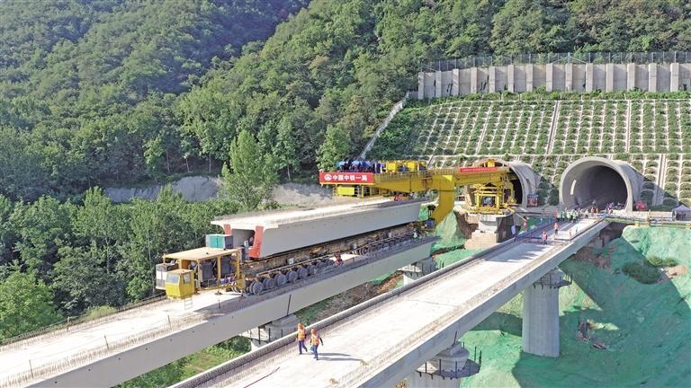 西康高鐵跨關(guān)中環(huán)線立交特大橋最后一孔箱梁架設(shè)現(xiàn)場(7月28日攝)。7月28日,隨著架橋機(jī)將一孔長32.6米、重431.75噸的箱梁平穩(wěn)落在西康高鐵跨關(guān)中環(huán)線立交特大橋……