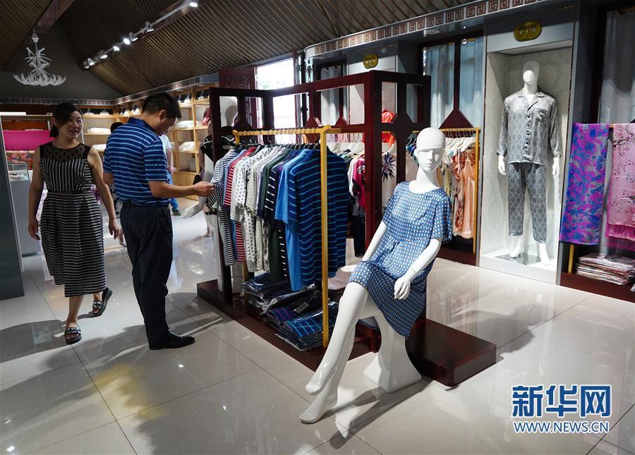 7月19日,游客在石泉蠶桑文化園內(nèi)挑選絲綢服裝。新華社記者 邵瑞 攝