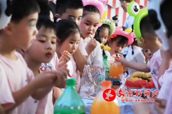 一段溫馨的共話離別。演出結(jié)束后,幼兒園給小朋友們準(zhǔn)備了各種美食,在五彩斑斕的夜光下自選幾種美食,好朋友們?cè)谝黄,品嘗美食,聊聊幼兒園開(kāi)心的事情,談?wù)勏矚g的東西。
