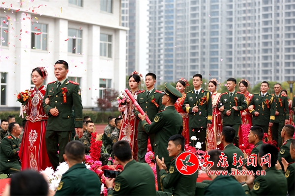 婚禮儀式現(xiàn)場,伴隨著《婚姻進行曲》和熱烈掌聲,新娘手挽新郎依次穿過“同心門”,在戰(zhàn)友們的見證下緩緩步入幸福的舞臺。該支隊領導為12對新人證婚,新郎與新娘十指緊扣,在眾人的見證下,面對武警部隊旗許下相守終身的軍婚誓言,并互換愛情信物、互送美好祝福,新郎代表、新娘代表依次登臺發(fā)言,熱烈的掌聲久久回蕩在營區(qū)上空。