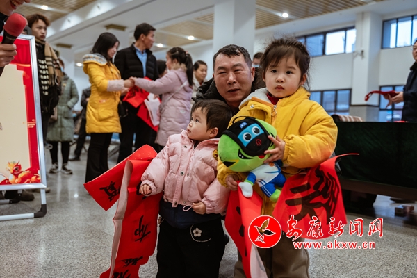 活動中,“驛路安康”愛心服務(wù)熱線工作人員身著安安、康康、龍辰辰人偶服,穿梭在人群中,一邊分發(fā)福字、對聯(lián),一邊與旅客們互動交流、合影留念。他們現(xiàn)場扶老攜幼、答疑解惑,熱情周到的服務(wù)溫暖了在場每一名旅客。
