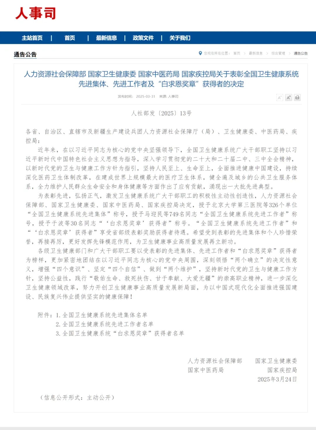近日,人力資源社會(huì)保障部、 國家衛(wèi)生健康委等四部委發(fā)布關(guān)于表彰全國衛(wèi)生健康系統(tǒng)先進(jìn)集體、先進(jìn)工作者及“白求恩獎(jiǎng)?wù)?rdquo;獲得者的決定,我市1個(gè)集體、1人分別獲得全國衛(wèi)生健康系統(tǒng)先進(jìn)集體、全國衛(wèi)生健康系統(tǒng)先進(jìn)工作者榮譽(yù)稱號(hào)。