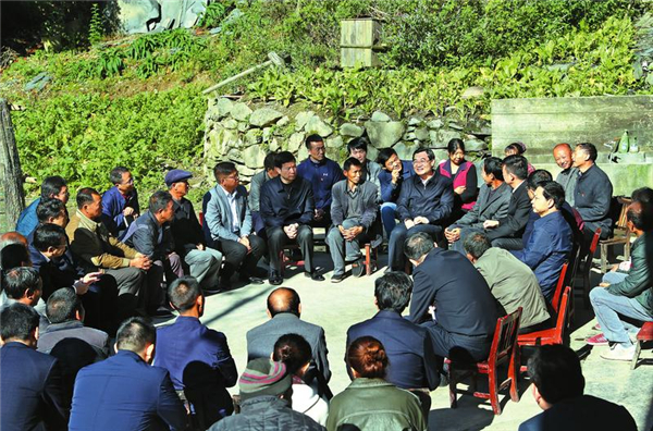 (10月10日,省委書記胡和平深入嵐皋縣南宮山鎮(zhèn)西河村,與部分群眾及鎮(zhèn)村干部進(jìn)行座談,了解扶貧工作進(jìn)展,聽取群眾意見建議,與大家一起商討脫貧致富的措施。陜西日?qǐng)?bào)記者 宋紅梅/攝)