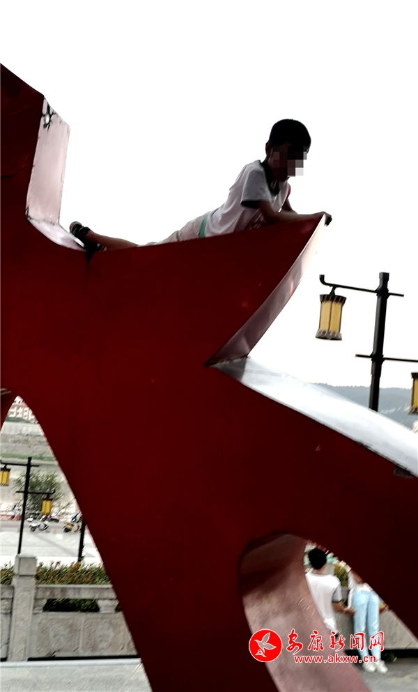 小孩攀爬漢調(diào)二黃園雕塑無(wú)人管