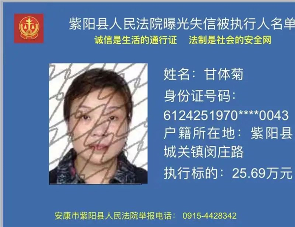 被執(zhí)行人甘體菊,你因不履行(2017)陜0924民初241號(hào)民事判決書確定的義務(wù),已被紫陽縣人民法院納入失信被執(zhí)行人名單庫依法進(jìn)行信用懲戒。信用懲戒范圍包括但不限于以下措施: