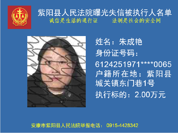被執(zhí)行人朱成艷,你因不履行(2017)陜0924民初241號民事判決書確定的義務(wù),已被紫陽縣人民法院納入失信被執(zhí)行人名單庫依法進(jìn)行信用懲戒。信用懲戒范圍包括但不限于以下措施: