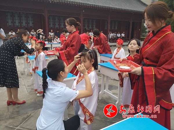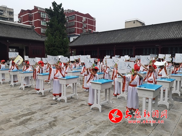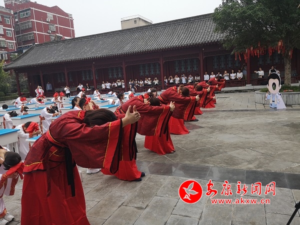 據(jù)了解,“開筆禮”是中國(guó)古代人生“四大禮”之首,是蒙童入學(xué)階段極為重要的儀式。“開筆禮”儀式主要分成六項(xiàng)內(nèi)容,每一項(xiàng)內(nèi)容承載著特定的教育目的。“正衣冠”要求學(xué)子們養(yǎng)成干凈整潔的生活習(xí)慣;“感恩鞠躬”讓學(xué)子向師長(zhǎng)行揖禮,謝師恩、謝親恩,并為師者和長(zhǎng)輩奉茶,讓他們從小懂得孝親尊師的道理;“凈手凈心”讓學(xué)子們從此靜心讀書,心無(wú)旁騖;“朱砂啟智”,表達(dá)了師長(zhǎng)對(duì)學(xué)子們的美好祝愿,希望他們心明眼亮,聰慧過(guò)人;“擊鼓明志”讓學(xué)子們樹立遠(yuǎn)大的理想與目標(biāo);“開筆啟蒙”書寫“人”字,學(xué)會(huì)做人的道理。蒙童通過(guò)親身經(jīng)歷這種莊嚴(yán)古樸的儀式,實(shí)現(xiàn)從蒙童到學(xué)生的心理過(guò)渡。