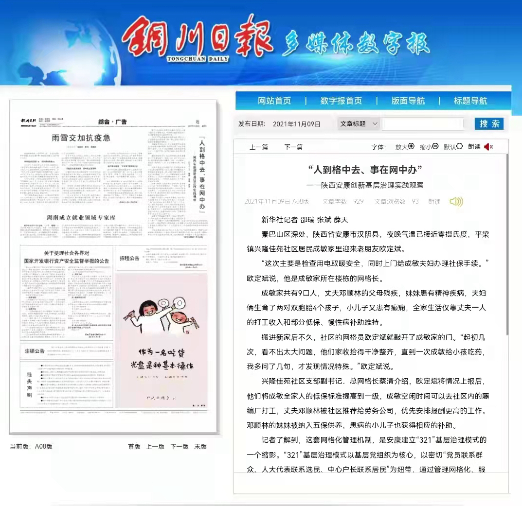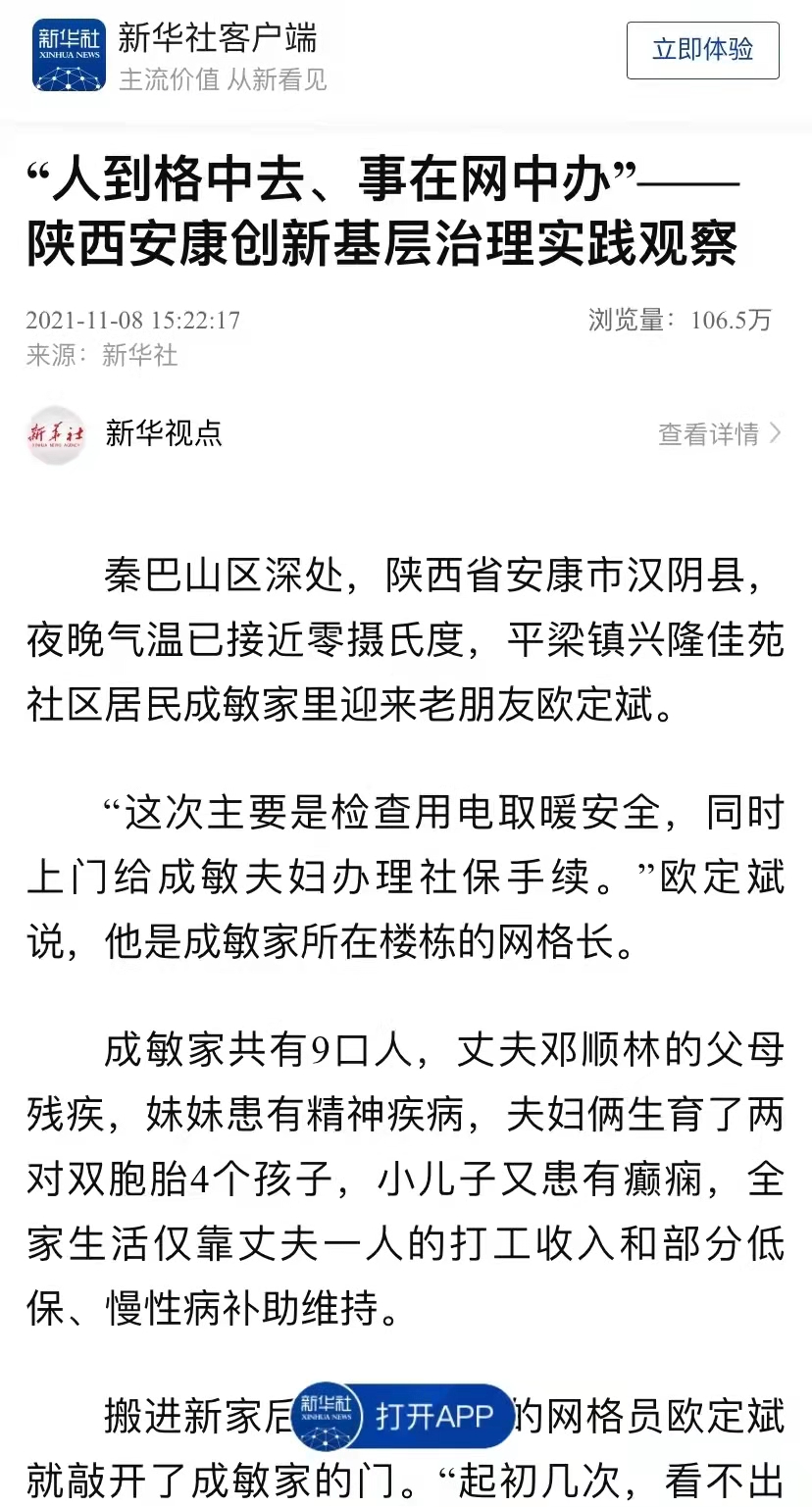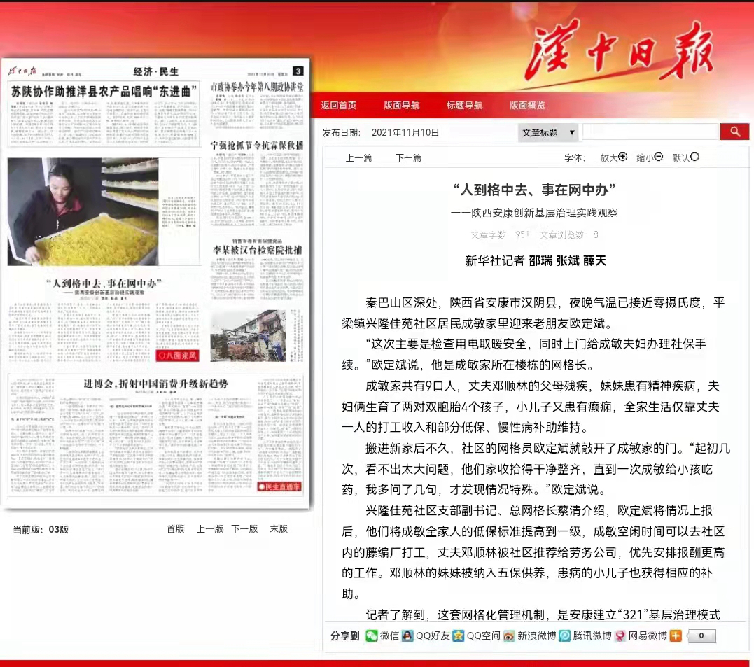 該模式是我市積極探索基層治理的生動(dòng)實(shí)踐,已在全市推廣。稿件發(fā)出后,新華網(wǎng)、光明網(wǎng)、半月談、中國(guó)小康網(wǎng)、21CN新聞、湖北日?qǐng)?bào)等80余家中省市媒體紛紛轉(zhuǎn)載,進(jìn)一步提升了我市“321”基層治理模式在全國(guó)范圍內(nèi)的影響力。一起來(lái)看看新華社記者眼中的安康基層治理實(shí)踐。