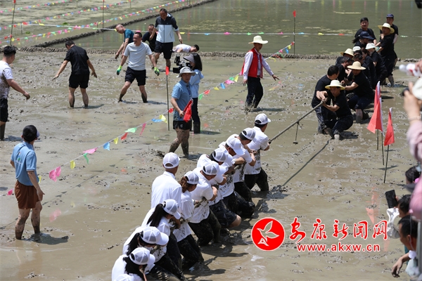 以藍(lán)天為背景,水田作舞臺(tái)。來(lái)自湖北省十堰市、白河縣、旬陽(yáng)市各鎮(zhèn)和仙河鎮(zhèn)各村(社區(qū))20個(gè)隊(duì)伍、400名運(yùn)動(dòng)員展開(kāi)一場(chǎng)場(chǎng)運(yùn)動(dòng)競(jìng)賽。只見(jiàn)隊(duì)員們挽起褲腳,赤腳下田,放肆追逐,盡情歡呼,插秧比賽、稻田拔河比賽、稻田摔跤比賽、渾水摸魚(yú)等環(huán)節(jié),重現(xiàn)歡鬧的勞作場(chǎng)景,上演著一場(chǎng)場(chǎng)關(guān)于泥、水、魚(yú)和人的快樂(lè)“較量”,觀眾也在還原農(nóng)耕場(chǎng)面原始風(fēng)俗、熱情勞作和農(nóng)忙氛圍中找到了童年最純真的模樣。