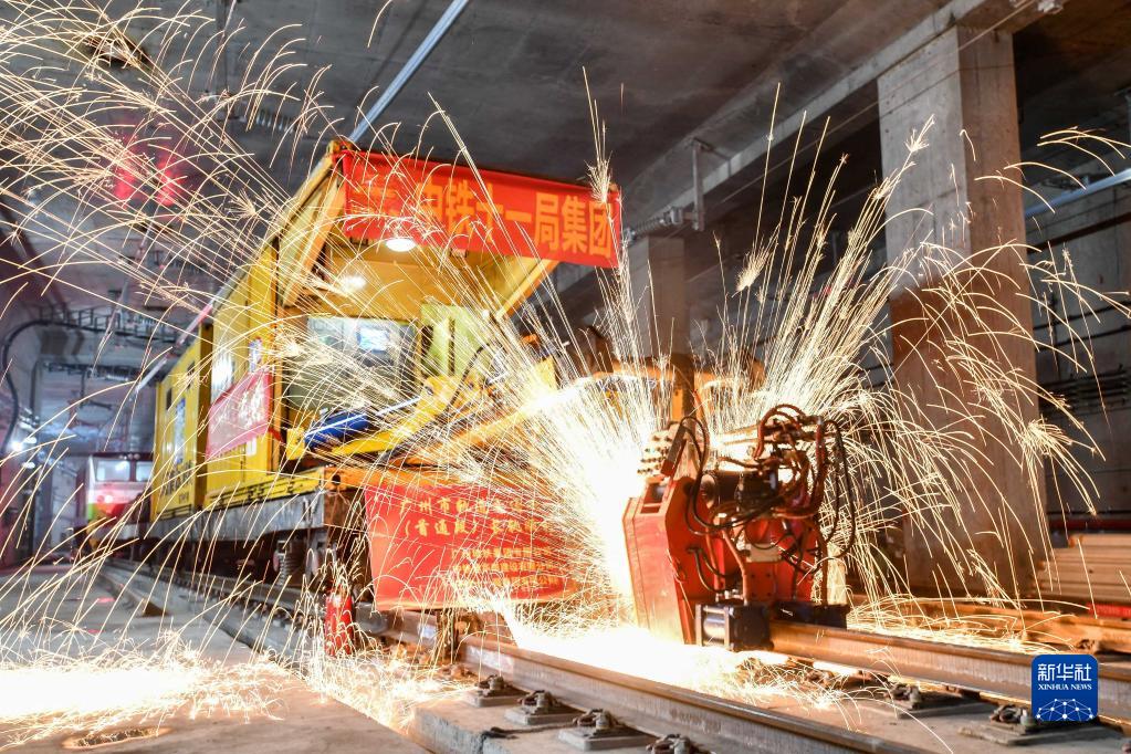中鐵十一局軌道焊機(jī)在焊接廣州地鐵18號(hào)線首通段最后一個(gè)鋼軌接頭(4月20日攝)。新華社記者 劉大偉 攝