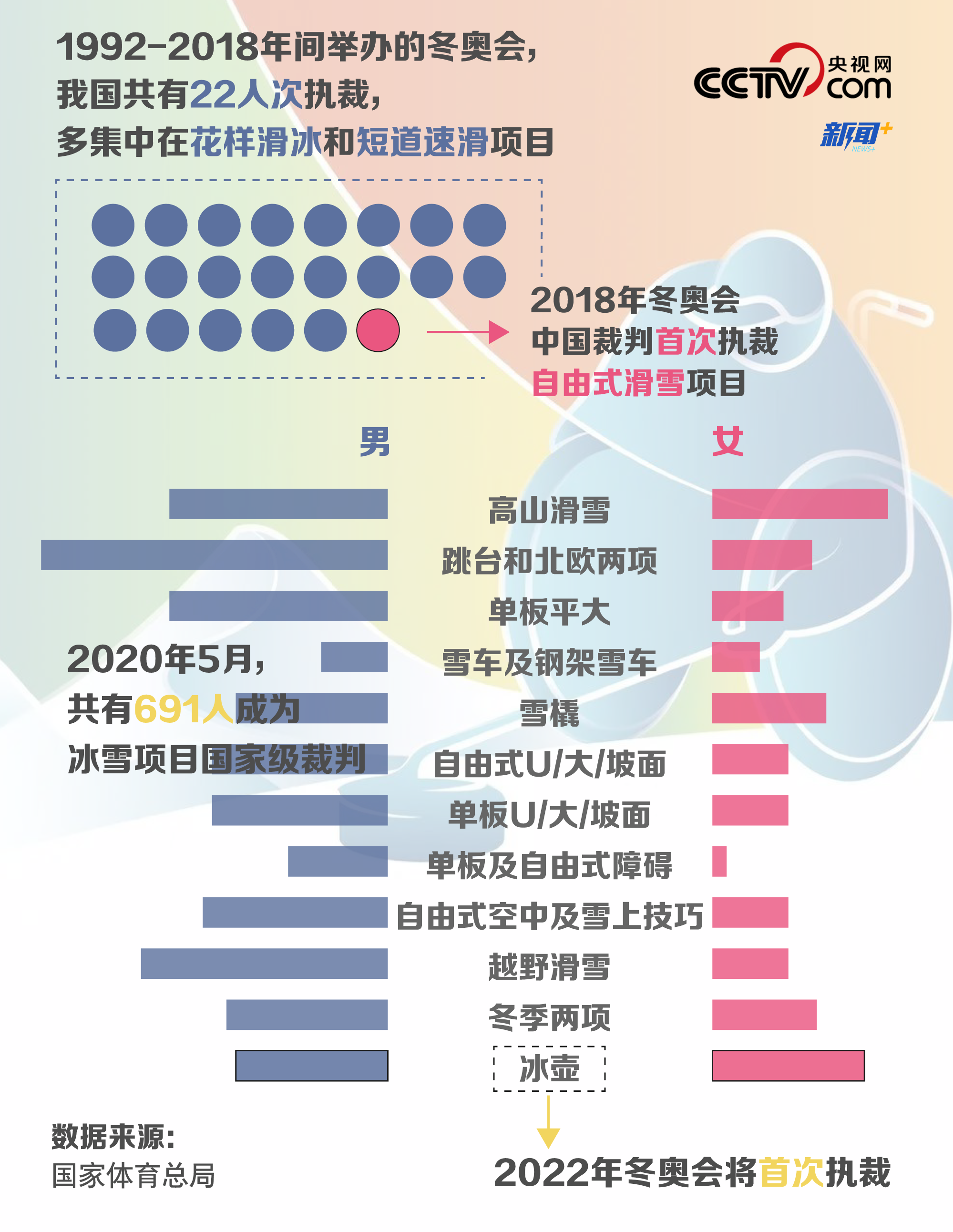 除了選手們在賽場上大放異彩,冬奧會賽場上的裁判席也開始出現(xiàn)“中國身影”。據(jù)統(tǒng)計,1992-2018年的冬奧會中,我國共有22人次擔(dān)任裁判,2018年的冬奧賽場上出現(xiàn)首位自由式滑雪空中技巧項目的中國裁判。為更好地做好冰雪項目競賽工作,體育總局冬運中心于2020年5月授予691人冰雪項目國家級裁判員稱號,其中多為雪上項目裁判員。值得一提的是,2022年冬奧會將有4名中國冰壺裁判首次執(zhí)裁。