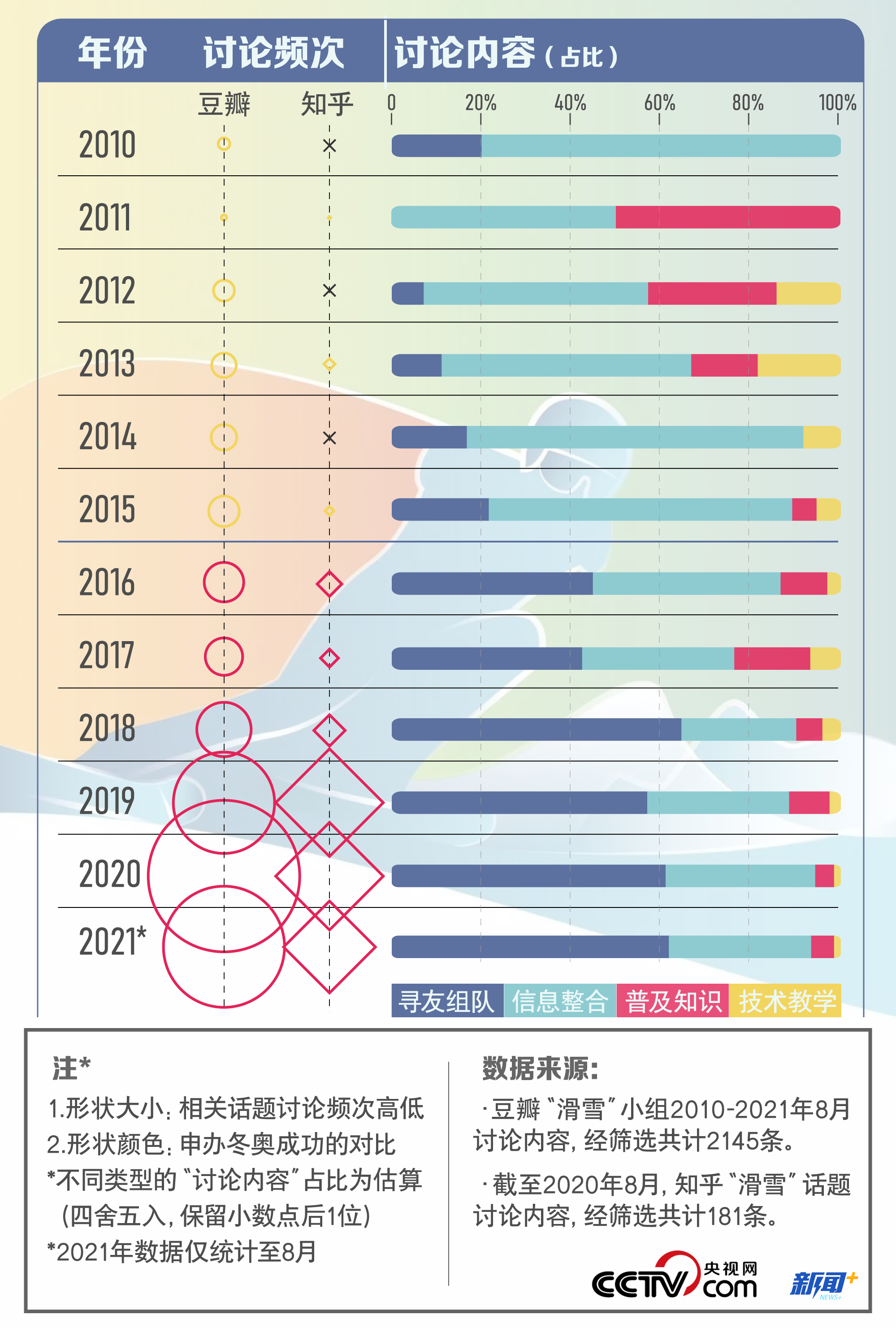 此外,人們對冰雪運動關(guān)注和討論的內(nèi)容也悄然改變。統(tǒng)計發(fā)現(xiàn),隨著中國互聯(lián)網(wǎng)的發(fā)展,2016年開始,“滑雪”在網(wǎng)絡(luò)平臺的討論頻次較前五年相比明顯增加,“尋友組隊”成為大部分愛好者的第一需求,而且討論的內(nèi)容也更為豐富多元,側(cè)面反映了滑雪項目正逐漸脫離“小眾”,走向“大眾”。
