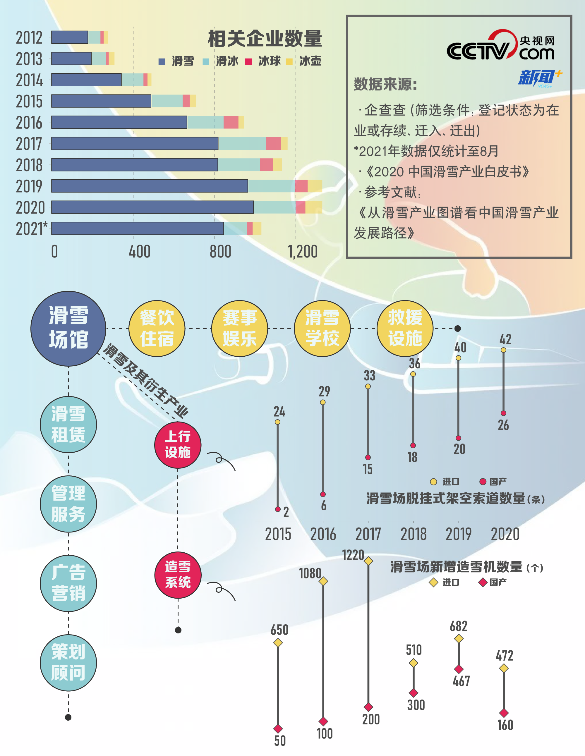 大眾對于冰雪運動的衍生需求給冰雪產(chǎn)業(yè)的發(fā)展奠定了一定基礎(chǔ)。近幾年,中國冰雪產(chǎn)業(yè)蓬勃發(fā)展,相關(guān)企業(yè)數(shù)量呈明顯上升趨勢,2020年僅“滑雪”類企業(yè)數(shù)量就超過2016年四類冰雪企業(yè)數(shù)量總和。同時,我國冰雪產(chǎn)業(yè)規(guī)模擴(kuò)大、覆蓋范圍也變廣,國產(chǎn)品牌逐漸“嶄露頭角”。比如國產(chǎn)脫掛式架空索道的發(fā)展勢頭迅猛,從2015年僅有個位數(shù)增長到2020年的26條,此外國產(chǎn)造雪機(jī)也正代替進(jìn)口商品被雪場經(jīng)營方使用。由此可見,人們對于冰雪的喜愛不僅表現(xiàn)在“直接參與”,還間接推動了衍生產(chǎn)業(yè)的發(fā)展。