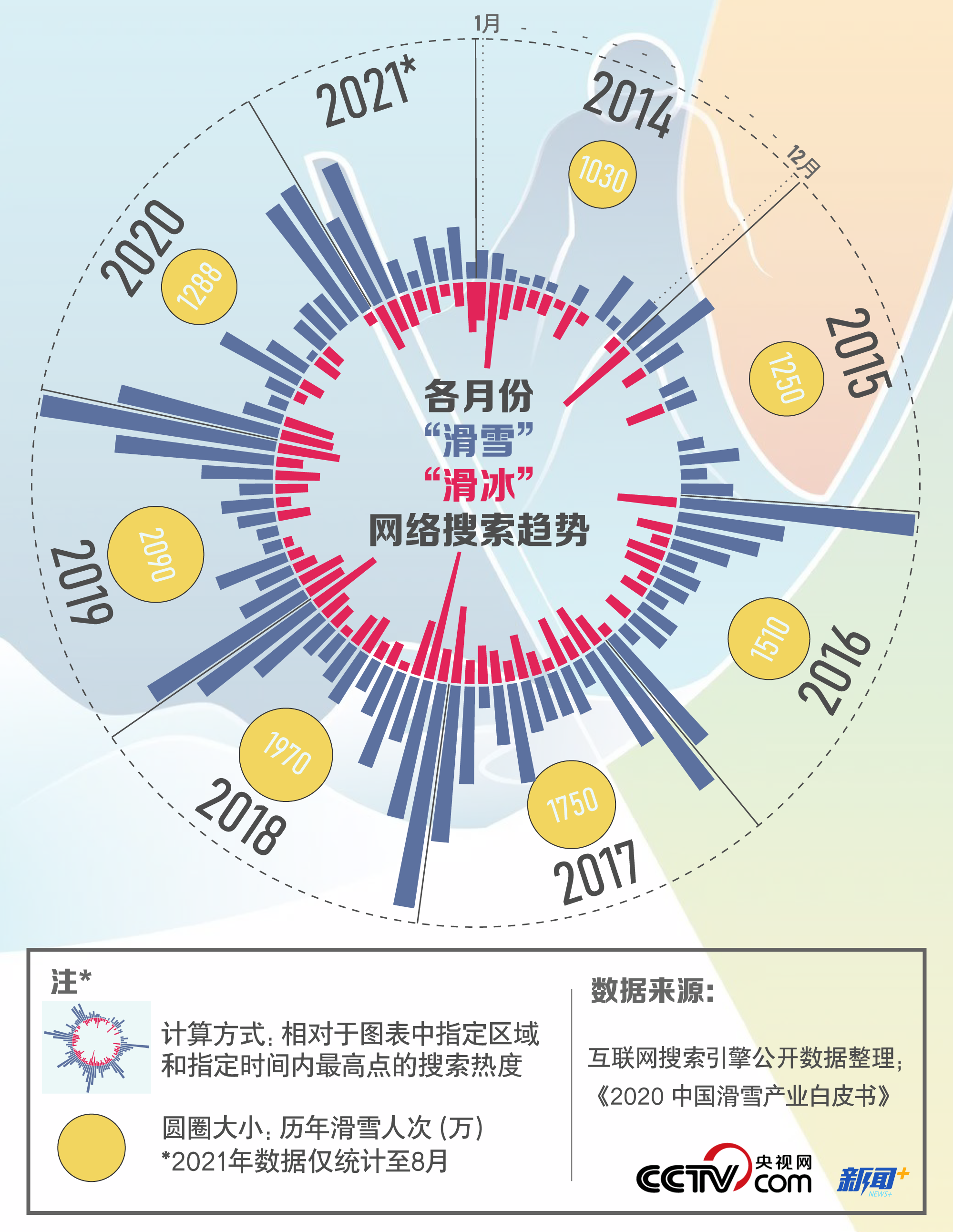 據(jù)央視網(wǎng)統(tǒng)計,自2016年起,公眾在互聯(lián)網(wǎng)搜索“滑雪”“滑冰”等冰雪項目的頻次明顯上升,且多集中在11月、12月和次年1月。除2020年受疫情防控的影響外,實際參與滑雪項目的群眾也逐年增多,2019年參與滑雪運動的人次是2014年的二倍。