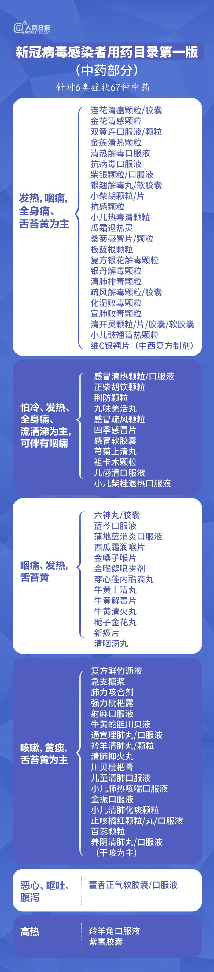 此版用藥目錄按照中西藥分開的原則,是對國家第九版診療方案中推薦用藥的完善和補充,針對發(fā)熱、咽痛等6類中醫(yī)診斷癥狀推薦67個中藥品種;針對咳嗽、咳痰等4類臨床癥狀推薦41個西藥品種。