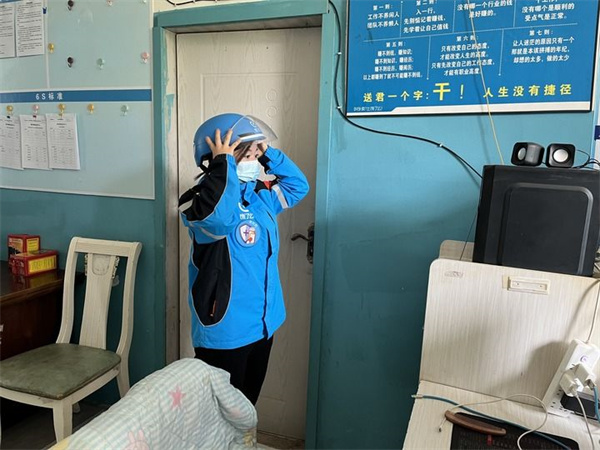 祖國(guó)大西北,寧夏銀川。4月29日下午4點(diǎn)半,外賣女騎手丁國(guó)梅麻利地穿起工服、戴上口罩、戴好頭盔,風(fēng)風(fēng)火火開始了晚高峰送餐。