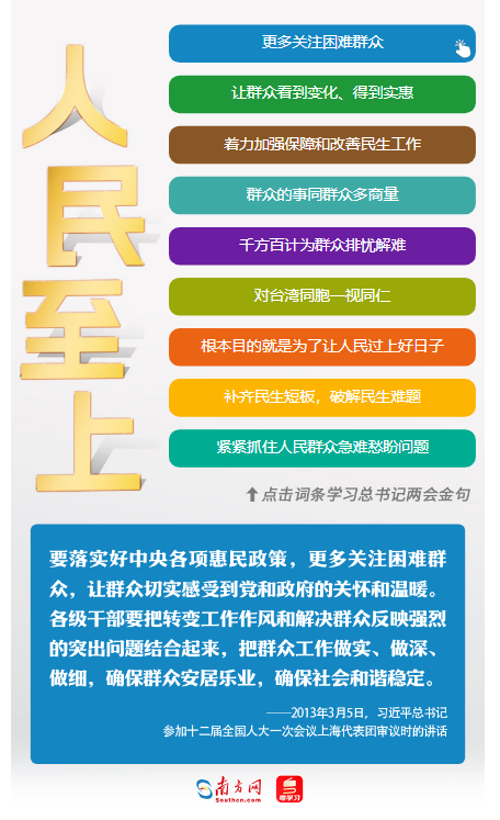 參加代表團審議,習近平總書記常常跟代表們提及民生工作、民生保障、民生改善等話題。“人民”二字在他心中分量最重。正如他所說,“黨團結(jié)帶領(lǐng)人民進行革命、建設(shè)、改革,根本目的就是為了讓人民過上好日子,無論面臨多大挑戰(zhàn)和壓力,無論付出多大犧牲和代價,這一點都始終不渝、毫不動搖。”