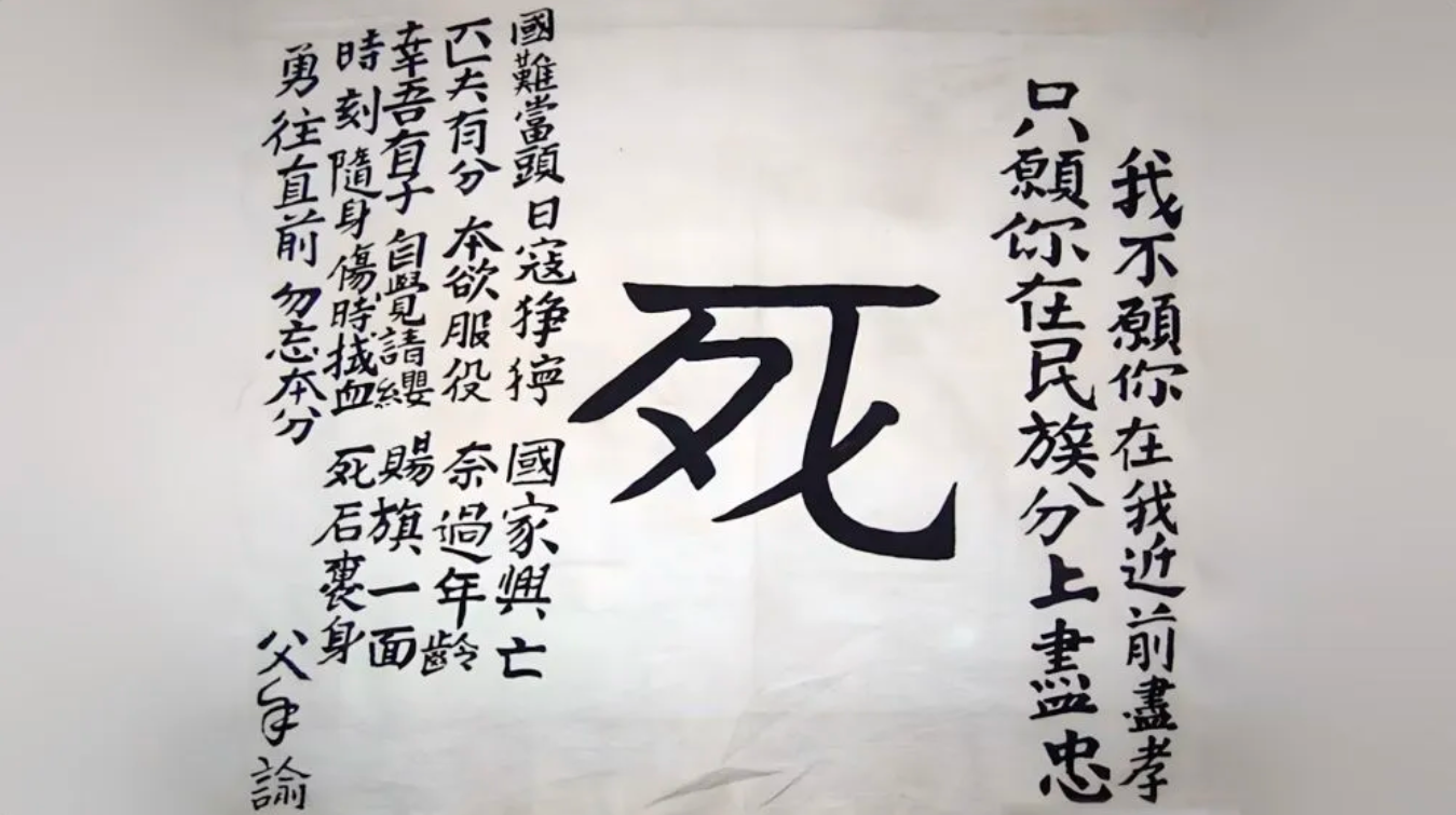 1937年9月,一位名叫王者成的中國父親把這面“死”字旗交給即將上戰(zhàn)場的兒子。
