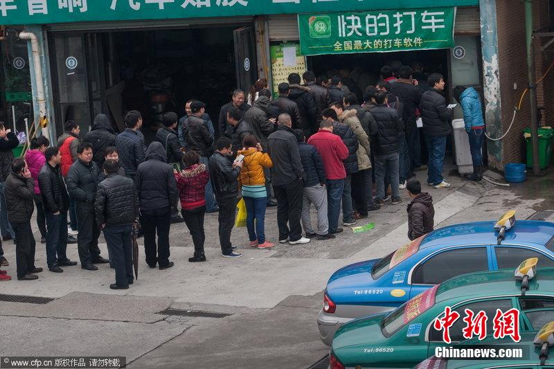 2014年2月19日,杭州“快的打車”服務(wù)點,出租車司機(jī)們排隊安裝軟件。圖片來源:CFP視覺中國